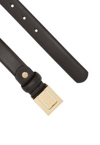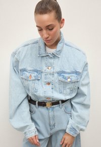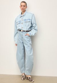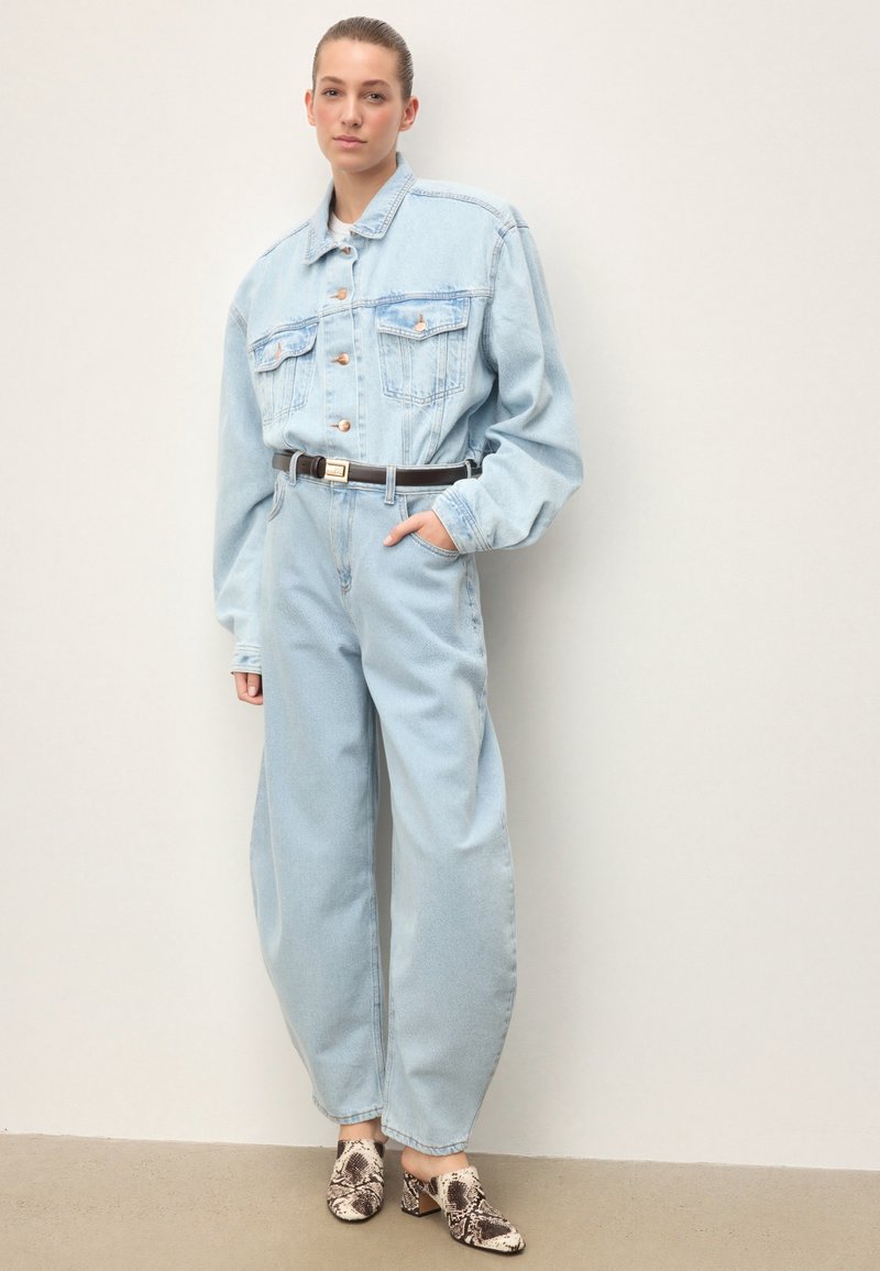 Γυναίκα στέκεται δίπλα σε τοίχο, φοράει ανοιχτό μπλε φαρδιά τζιν μπουφάν και φαρδιά τζιν παντελόνια με μαύρη ζώνη και ψηλοτάκουνα mule με σχέδιο φίδι.