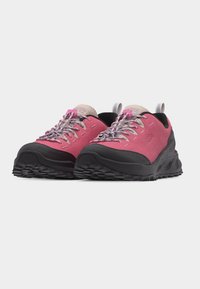 Ροζ και μαύρο παπούτσι πεζοπορίας με χαμηλή κοπή, κλείσιμο με κορδόνια και ανθεκτική σόλα, σχεδιασμένο για χρήση σε εξωτερικά μονοπάτια.
