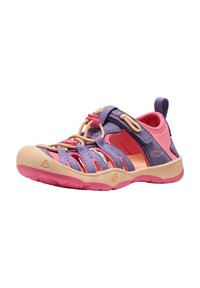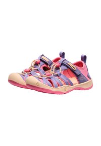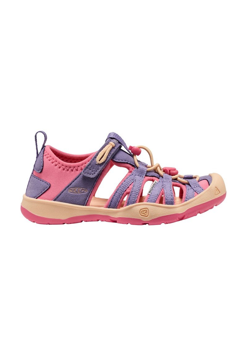 Παιδικό πέδιλο με κλειστή μύτη σε ροζ, μωβ και μπεζ χρώμα, με ρυθμιζόμενα ελαστικά κορδόνια και προστατευτική ραβέρ σόλα σε λευκό φόντο.