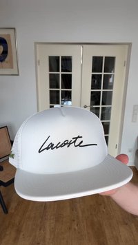 Λευκό καπέλο φορτηγατζή με επίπεδο γείσο και μαύρο λογότυπο σε σενάριο στο εμπρός μέρος, με πλέγμα πίσω πάνελ για αερισμό.