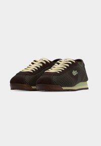 Αθλητικά παπούτσια Lacoste με καφέ πλέγμα πάνω μέρος, κρέμ κορδόνια, πράσινες λεπτομέρειες και λαστιχένια σόλα, τοποθετημένα σε ξύλινη επιφάνεια.