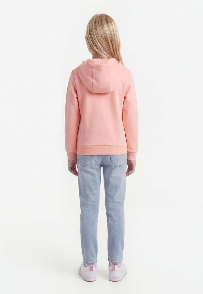 Παιδί με μακριά ξανθά μαλλιά, που στέκεται με την πλάτη προς το μέρος μας, φορώντας ροζ φούτερ με κουκούλα, ανοιχτόχρωμο μπλε τζιν και λευκά αθλητικά παπούτσια με ροζ λεπτομέρειες.