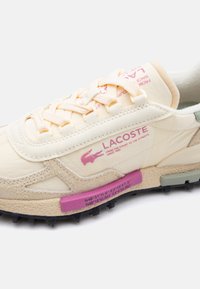 Κρεμ και μπεζ αθλητικό παπούτσι Lacoste με ανθεκτική μαύρη σόλα, ροζ λογότυπο, και πράσινη ταμπέλα στη φτέρνα, εμφανιζόμενο από αριστερή πλευρά σε λευκό φόντο.