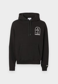 Λευκό φούτερ με καγκουρό τσέπη, κουκούλα με κορδόνι και πράσινο λογότυπο Lacoste και κείμενο στο στήθος. Φορεμένο με σκούρες πράσινες παντελόνες.