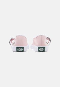 Ανοιχτό ροζ πάνινο παπούτσι Mary Jane με λευκή λαστιχένια σόλα, λευκή μύτη, ρυθμιζόμενο λουράκι με πόρπη και πράσινο λογότυπο κροκοδείλου στο πλάι.