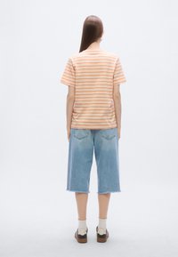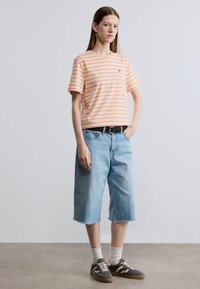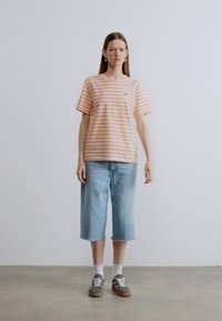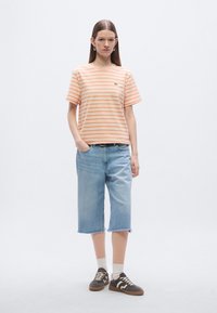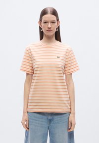 Πορτοκαλί και λευκή κοντομάνικη ριγέ μπλούζα από βαμβάκι, με στρογγυλή λαιμόκοψη και μικρό πράσινο λογότυπο στο στήθος.