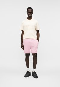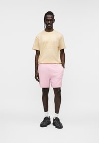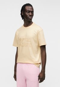Ανοιχτό κίτρινο βαμβακερό μπλουζάκι με ανάγλυφο λογότυπο "LACOSTE" και σχέδιο κροκόδειλου, συνδυασμένο με απαλό ροζ σορτς με υφή.