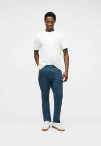 Άντρας με απλό λευκό T-shirt με κοντό μανίκι και μικρό κείμενο στο αριστερό μέρος του στήθους, φορώντας μπλε τζιν, στέκεται μπροστά σε απλό ανοιχτό γκρι φόντο.