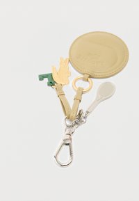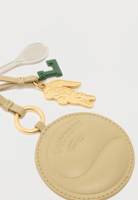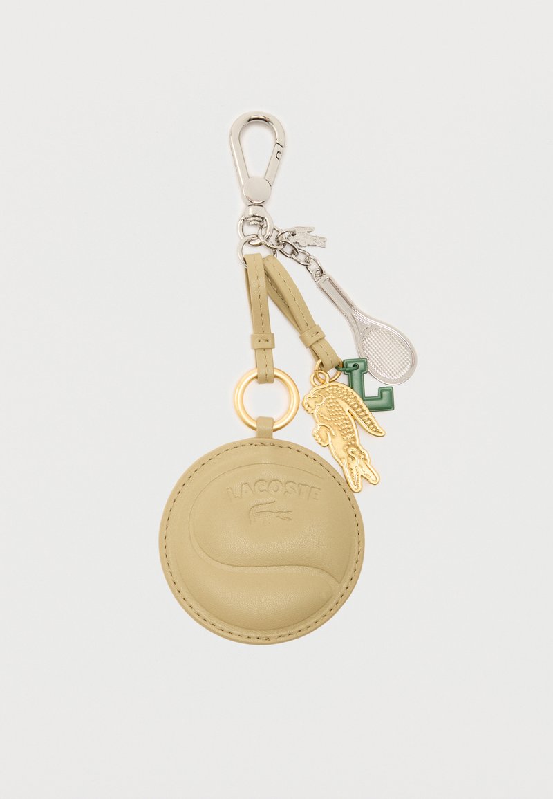 Μπεζ στρογγυλό δερμάτινο μπρελόκ με το λογότυπο της Lacoste, χρυσό γοργόνα κροκόδειλου, πράσινο γούρι "L" και ασημί γούρι ρακέτας τένις σε μεταλλικό κλιπ.