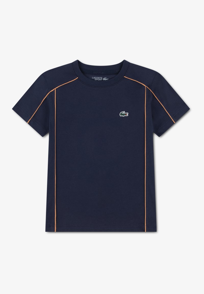 Μπλε ναυτικό βαμβακερό μπλουζάκι με κοντά μανίκια, με πορτοκαλί ραφές στους ώμους και μικρό πράσινο λογότυπο στο στήθος.