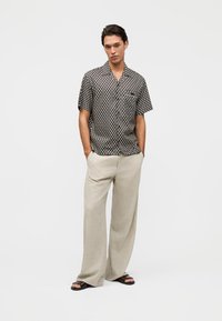 Άνδρας που φοράει μαύρο πουκάμισο με κοντά μανίκια και λευκό γεωμετρικό σχέδιο και ανοιχτό μπεζ παντελόνι, στέκεται μπροστά σε μονόχρωμο φόντο.