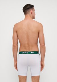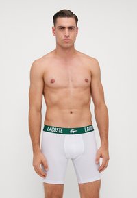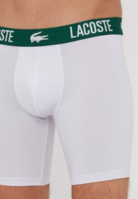 Λευκά μποξεράκια με ζώνη λογοτύπου Lacoste σε πράσινο χρώμα. Το ύφασμα φαίνεται λείο και ελαστικό, αγκαλιάζοντας το σώμα. Το μοντέλο στέκεται όρθιο.