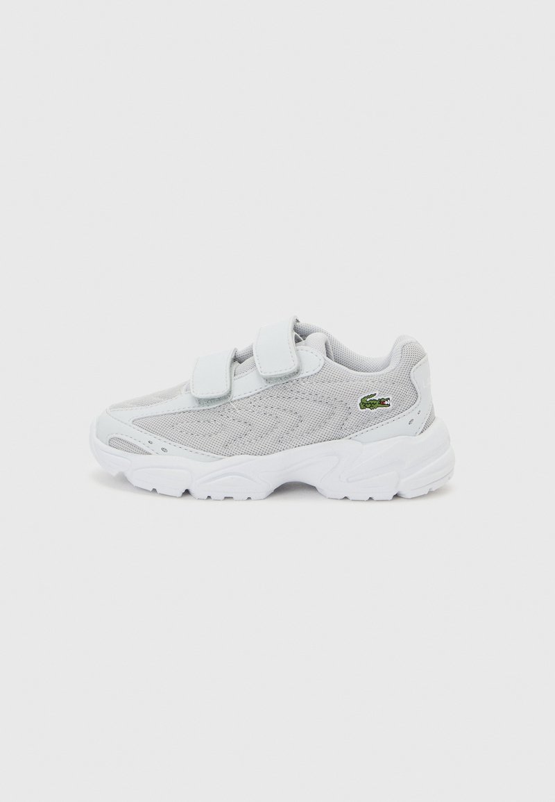 Λευκό αθλητικό παπούτσι με πλέγμα στο επάνω μέρος, διπλή λουρίδα με βέλκρο, παχιά σόλα και μικρό πράσινο λογότυπο κροκοδείλου στη πλευρά.