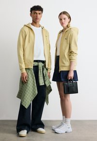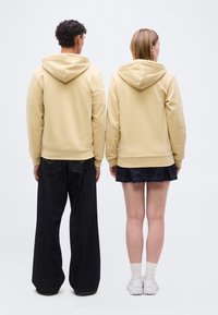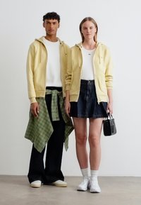 Νεαρή γυναίκα και άνδρας στέκονται δίπλα δίπλα φορώντας ταιριαστά ανοιχτόκίτρινα φούτερ με φερμουάρ και μπροστινές τσέπες, και οι δύο κοιτούν μπροστά σε λευκό φόντο.