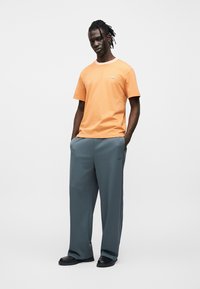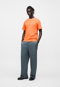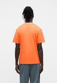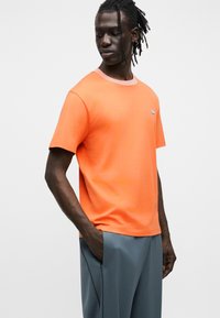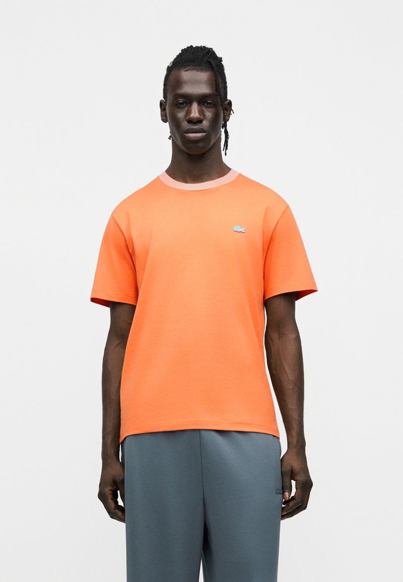 Πορτοκαλί βαμβακερό μπλουζάκι με στρογγυλή λαιμόκοψη και κοντά μανίκια. Διαθέτει μικρό μπλε λογότυπο στο στήθος και αντίθετη λαιμόκοψη.