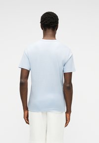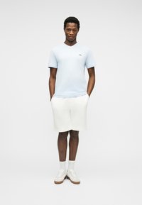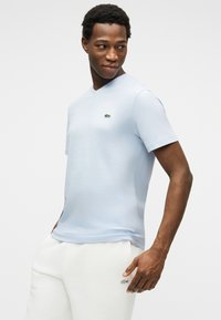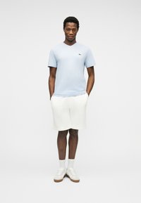 Άνδρας που φοράει ανοιχτό γαλάζιο T-shirt με V λαιμόκοψη και μικρό πράσινο λογότυπο κροκόδειλου στο αριστερό στήθος και άσπρα σορτς, στέκεται μπροστά σε απλό φόντο.