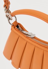 Πορτοκαλί τσάντα με πιέτες, με κοντή λαβή και αποσπώμενο φαρδύ υφασμάτινο ιμάντα με μεταλλικά κούμπωμα, σε ανοιχτό φόντο.