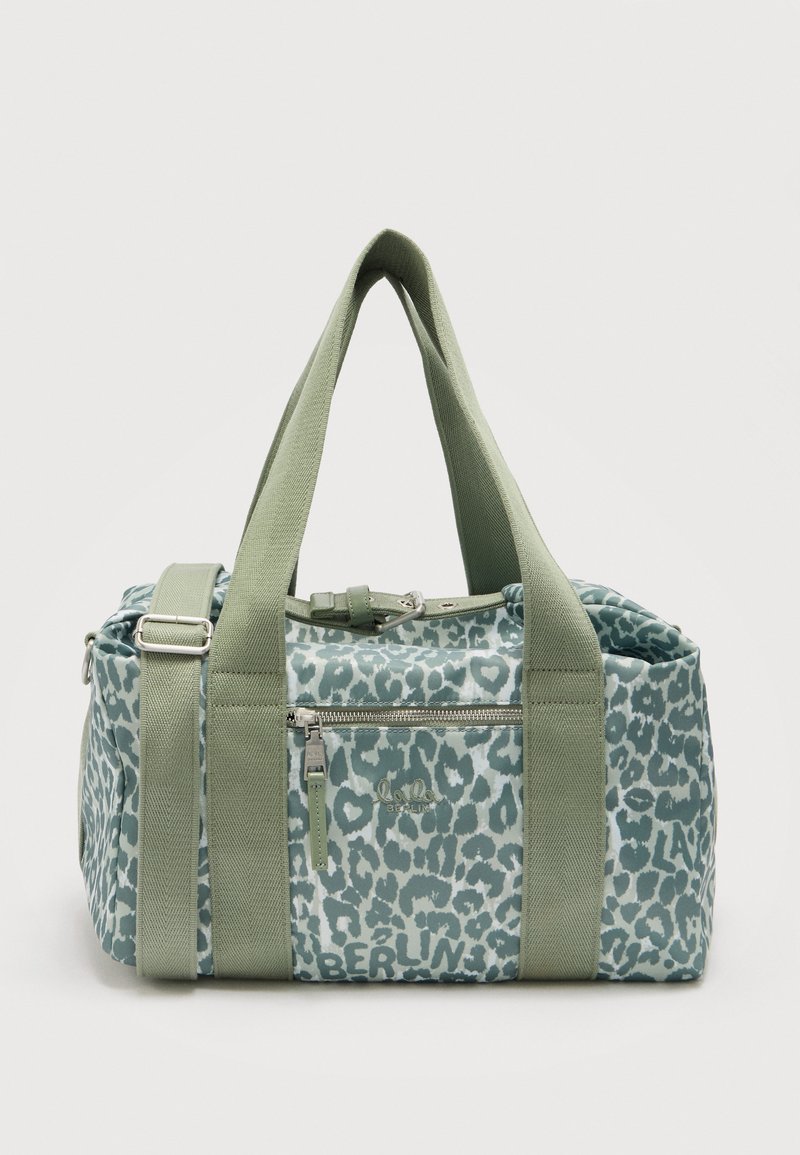 Τσάντα duffel με τύπωμα λεοπάρ σε πράσινο και ανοιχτό μπλε, διπλές λαβές και ρυθμιζόμενο λουρί ώμου, εμπρόσθια τσέπη με φερμουάρ και μοτίβο με το κείμενο "Berlin".