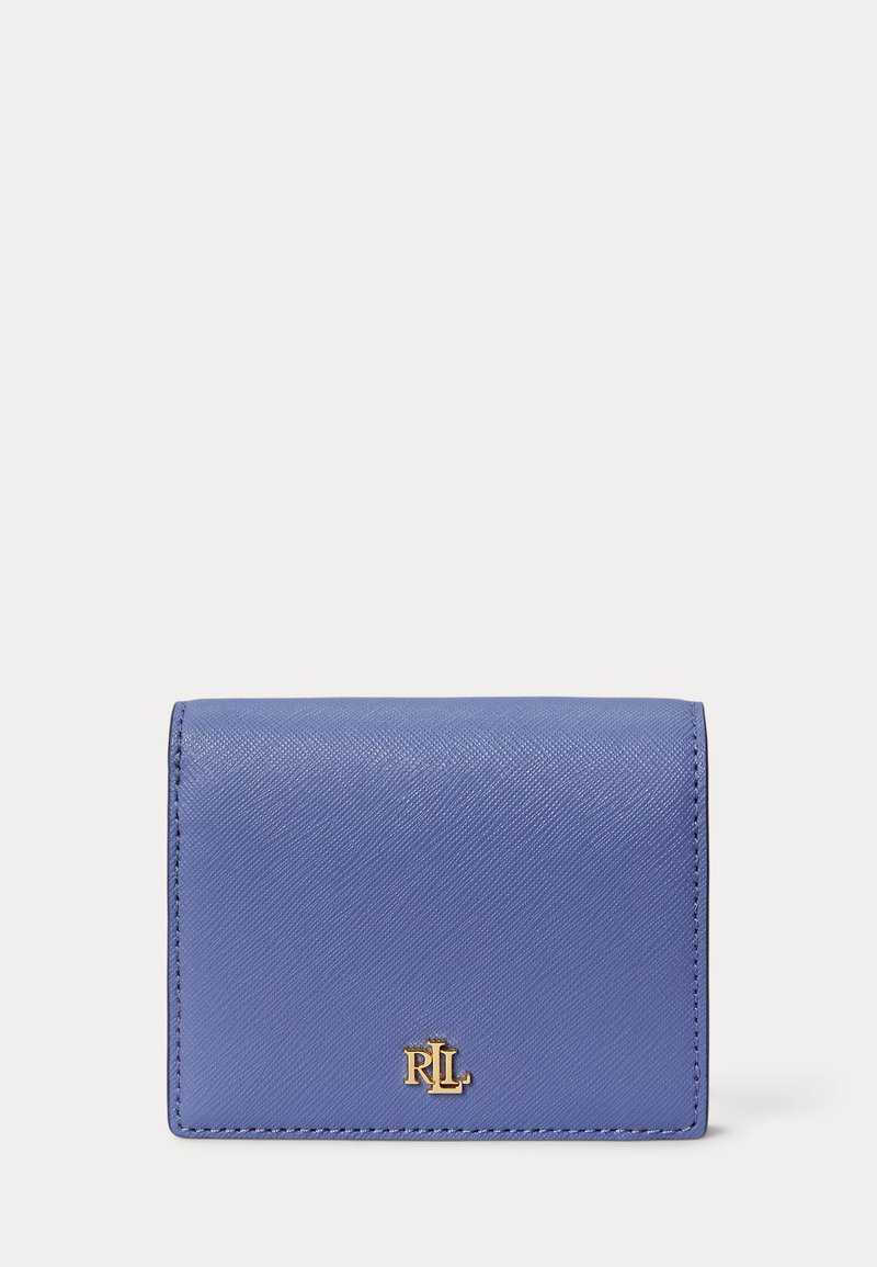 Μικρό πορτοφόλι από δέρμα saffiano σε χρώμα περιβάλλοντος με χρυσό λογότυπο RL στο κέντρο της εμπρός πτερυγίας πάνω σε απλό φόντο.