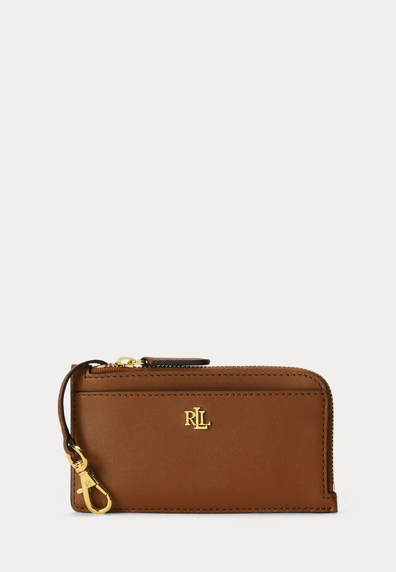 Καφέ δερμάτινο πορτοφόλι με φερμουάρ γύρω, χρυσό λογότυπο RL, λουράκι καρπού και χρυσό μεταλλικό κούμπωμα σε λευκό φόντο.