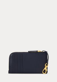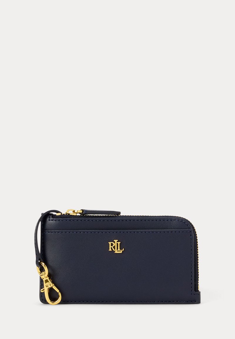 Πορτοφόλι από δέρμα σε ναυτικό μπλε χρώμα με φερμουάρ, χρυσό λογότυπο RL και χρυσό κρίκο για κλειδιά προσαρτημένο στην αριστερή πλευρά.