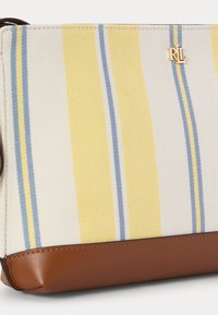 Τσαντάκι καρπού με κάθετες ρίγες σε κίτρινο, μπλε και άσπρο, καφέ δερμάτινη βάση και μικρό χρυσό λογότυπο "RL" στο μπροστινό μέρος.