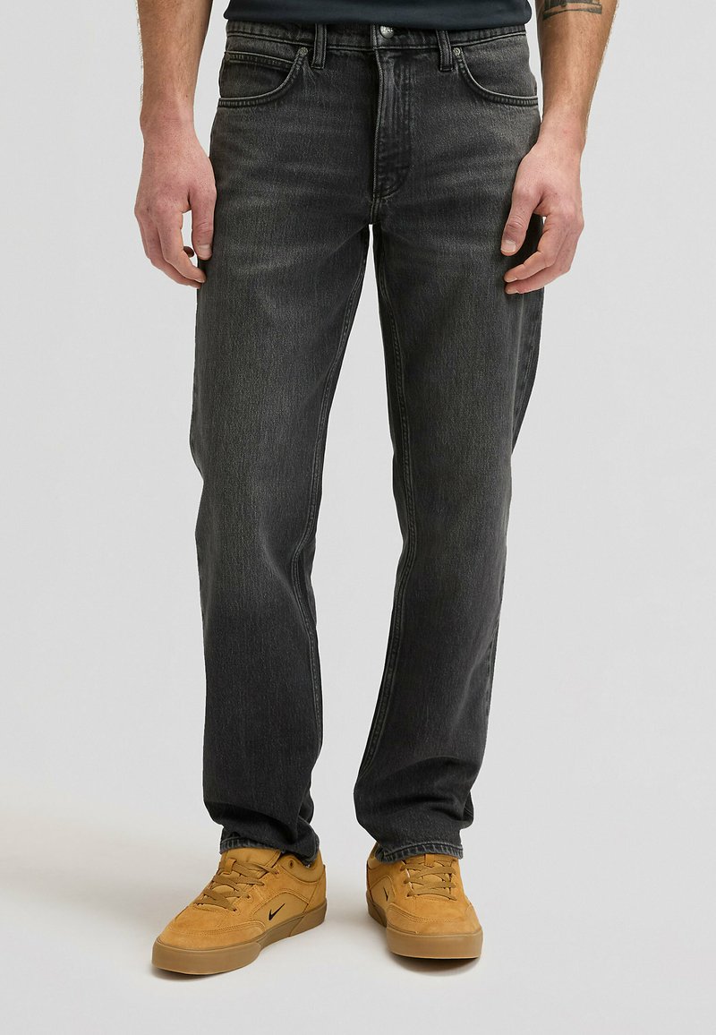 Άνδρας που φοράει ξεθωριασμένο μαύρο τζιν και μουσταρδί αθλητικά παπούτσια Nike, στέκεται μπροστά σε ουδέτερο φόντο.
