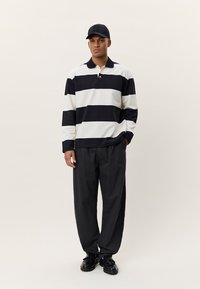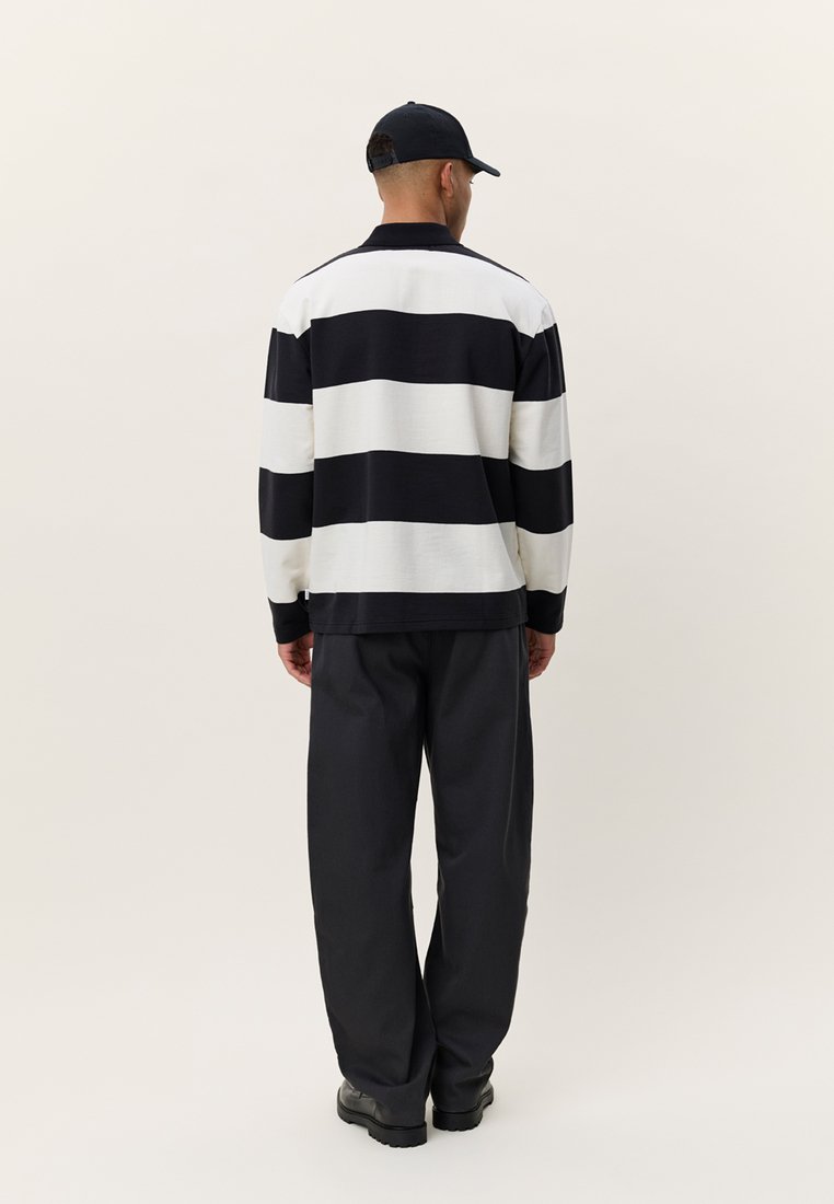 Πολυτελές μακρυμάνικο πόλο με μαύρες και λευκές ρίγες και γιακά, συνδυασμένο με φαρδιά μαύρα παντελόνια και μαύρο καπέλο, από την πλάτη.