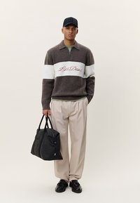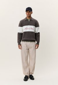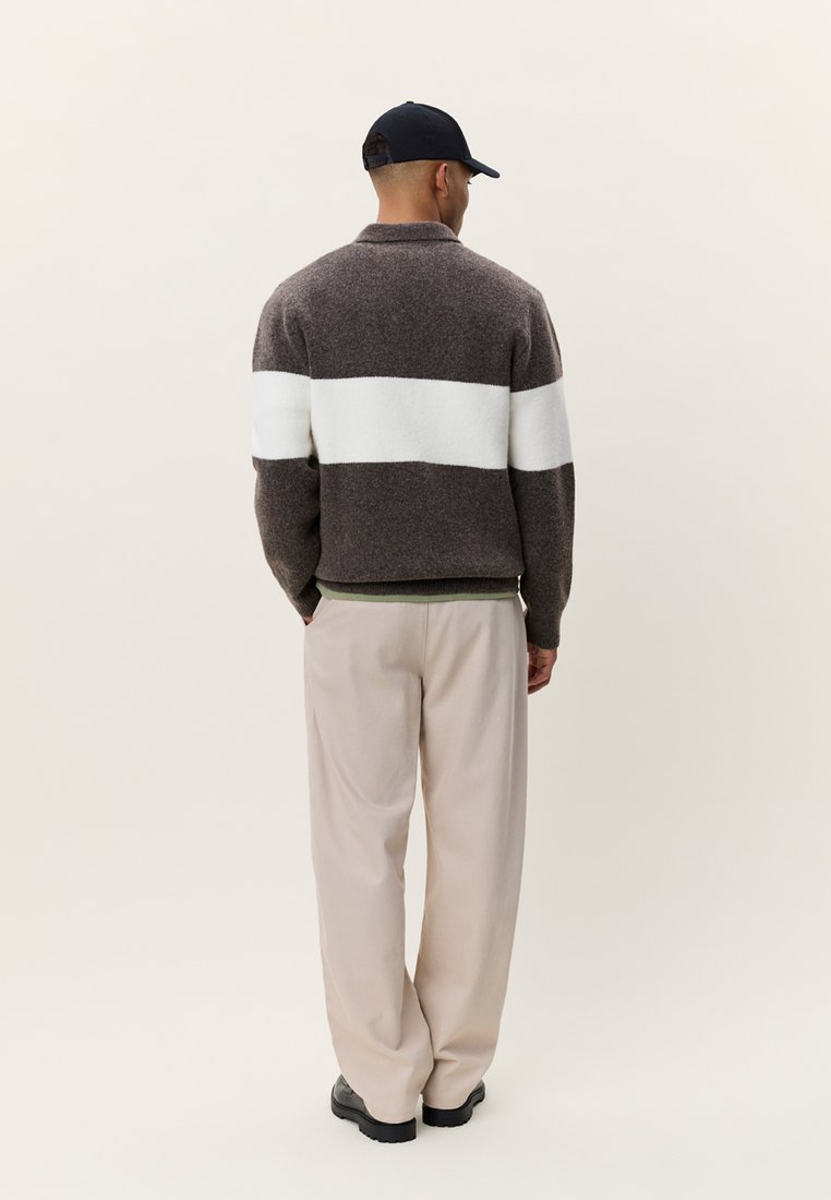 Καφέ και εκρού πουλόβερ με ρίγες και γιακά, φορεμένο με ανοιχτό μπεζ παντελόνι και μαύρα παπούτσια, από πίσω.