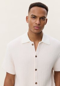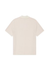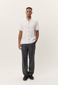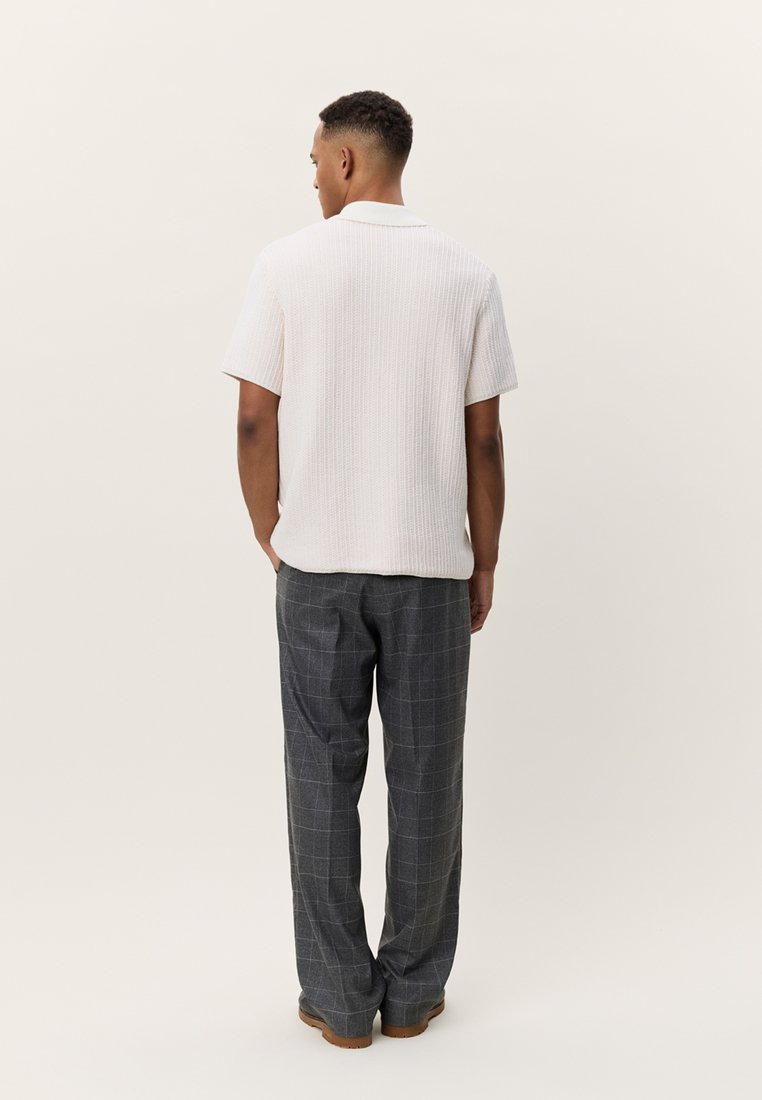 Λευκό πουκάμισο με κοντό μανίκι και υφή υφάσματος, σετ με γκρι καρό παντελόνι και καφέ παπούτσια. Φαίνεται από πίσω.