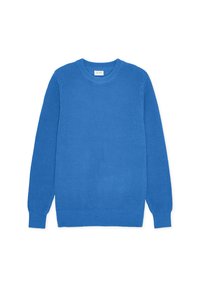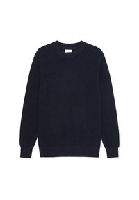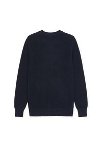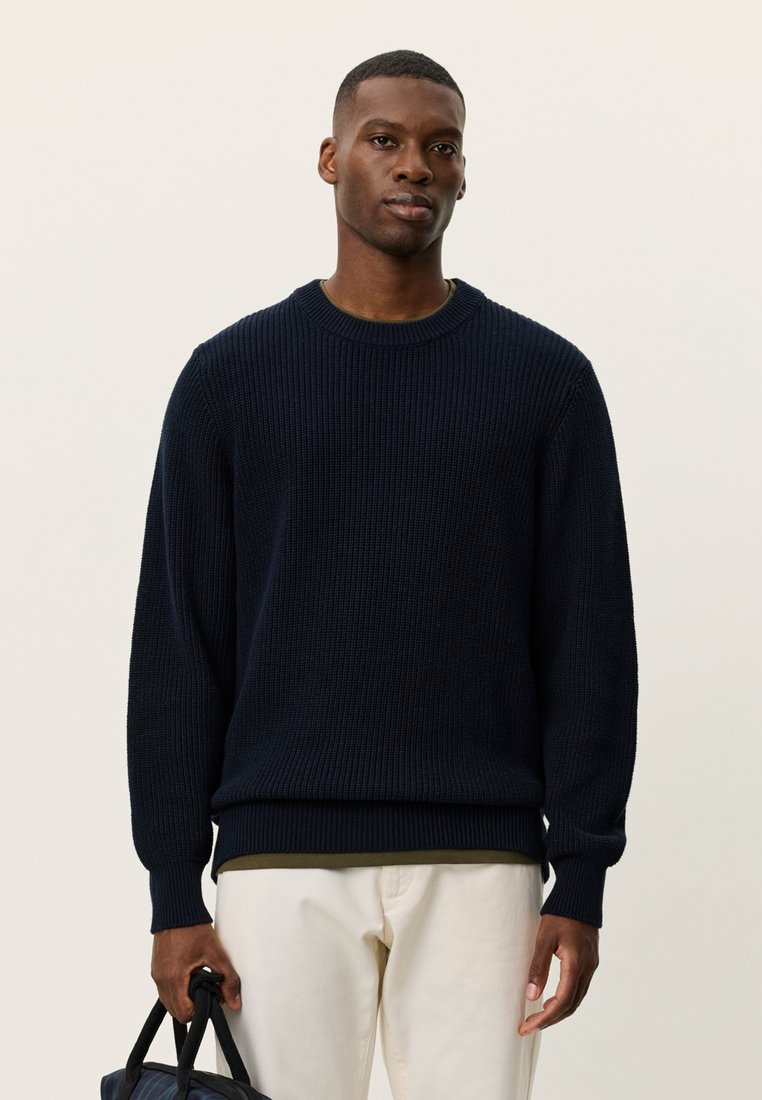 Πλεκτό πουλόβερ σε ναυτικό μπλε χρώμα με ριγωτή υφή, στρογγυλή λαιμόκοψη και μακριά μανίκια. Φορεμένο πάνω από ένα πράσινο στρώμα, συνδυασμένο με παντελόνι κρεμ και μία τσάντα.