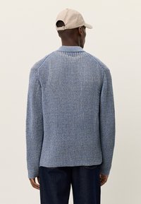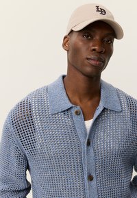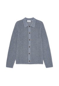 Ανοιχτό μπλε πλεκτή ζακέτα με γιακά, κουμπιά στο μπροστινό μέρος και υφή με σχέδιο. Φοριέται πάνω από λευκό πουκάμισο και σκούρο τζιν παντελόνι.