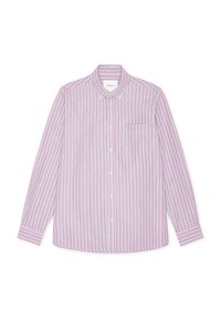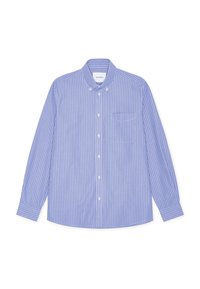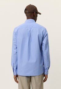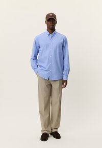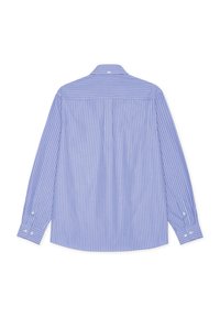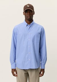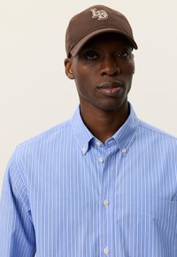 Μπλε ανοιχτό και λευκό ριγέ πουκάμισο με κουμπιά, μακριά μανίκια και τσέπη στο στήθος, κατασκευασμένο από υφαντό ύφασμα. Καφέ καπέλο με λογότυπο.
