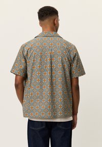 Πουκάμισο με κοντά μανίκια σε μπλε, πορτοκαλί και κρεμ αποχρώσεις με επαναλαμβανόμενο λουλουδάτο σχέδιο και γιακά τύπου καμπ. Φορεμένο πάνω από ένα ανοιχτόχρωμο t-shirt.