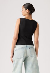 Γυναίκα που φοράει αμάνικη μαύρη μπλούζα και ανοιχτόχρωμο μπλε τζιν, όρθια με τα χέρια στις τσέπες μπροστά σε απλό φόντο.