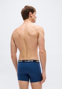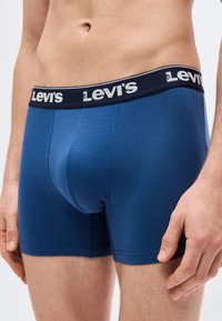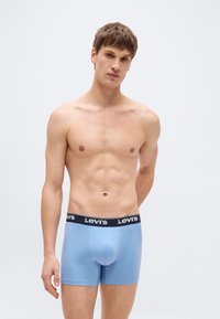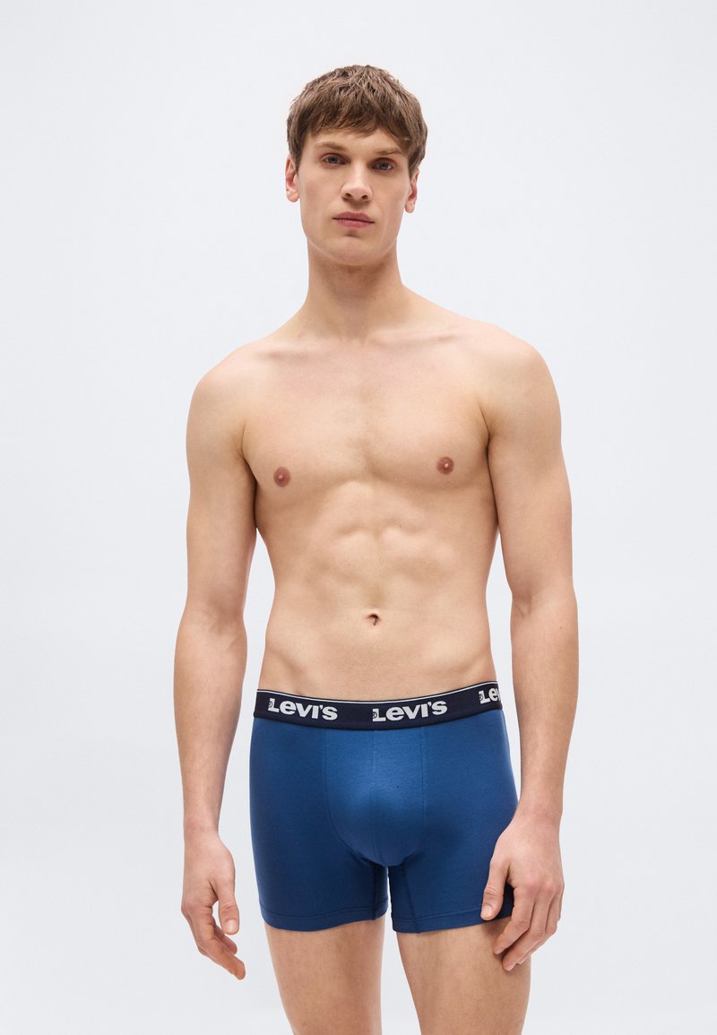 Νεαρός άνδρας που στέκεται φορώντας μπλε boxer Levi's με μαύρη μέση, απλό ανοιχτό φόντο, ουδέτερη έκφραση, με τα χέρια χαλαρά.