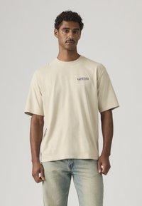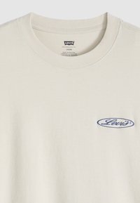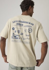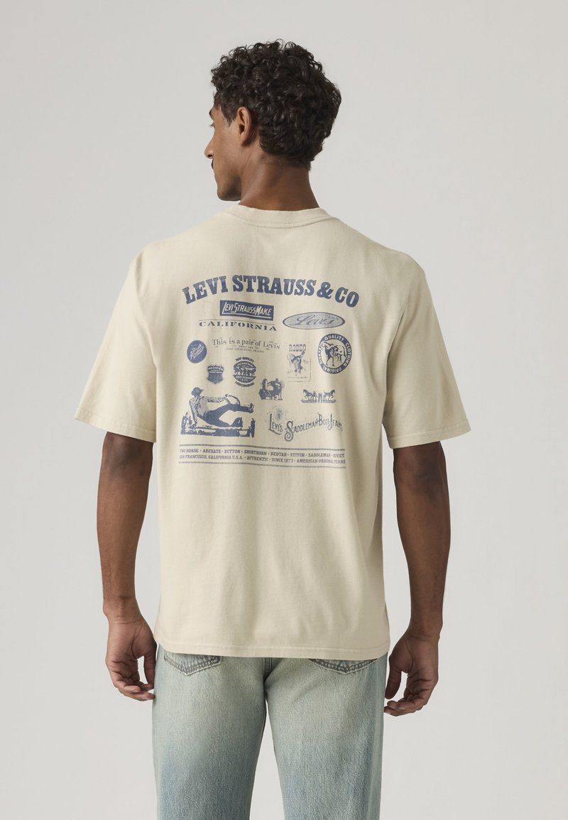 Άνδρας φαινόμενος από πίσω φοράει μια μπεζ μπλούζα Levi's με μπλε ρετρό λογότυπα και κείμενο, συνδυασμένη με ανοιχτό μπλε τζιν.