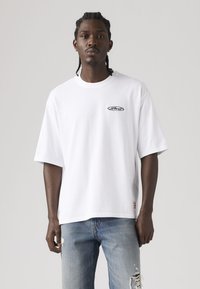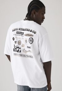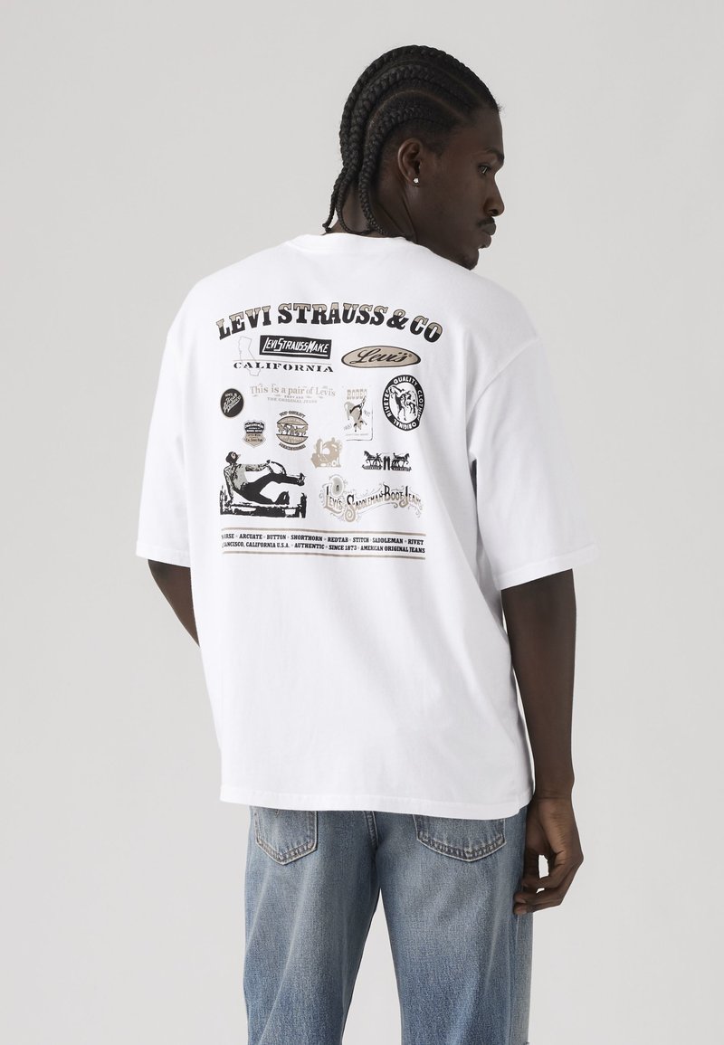 Άνδρας με πλεξούδες που φοράει λευκό T-shirt Levi's με vintage λογότυπα και κείμενο στο πίσω μέρος, συνδυασμένο με ανοιχτό μπλε τζιν, γυρισμένος προς τα πίσω.