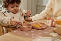 Νήπιο με σγουρά μαλλιά κάθεται σε τραπέζι, κρατώντας ένα κουτάλι πάνω από ένα μπολ με φαγητό, με φέτες πεπονιού και ένα ποτήρι κοντά σε ένα σουπλά.
