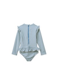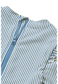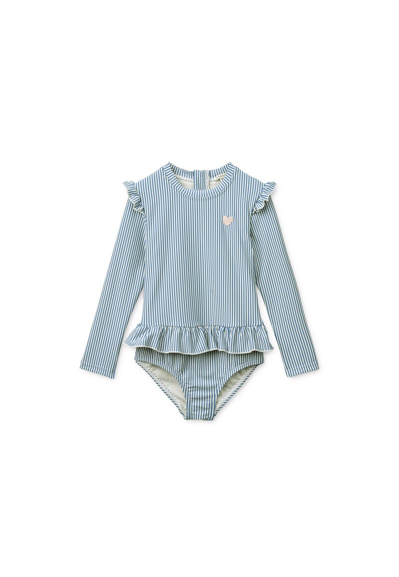 Ολόσωμο μαγιό με μακριά μανίκια σε μπλε και λευκές κατακόρυφες ρίγες, με βολάν στο τελείωμα και μικρό έμβλημα καρδιάς στο στήθος.