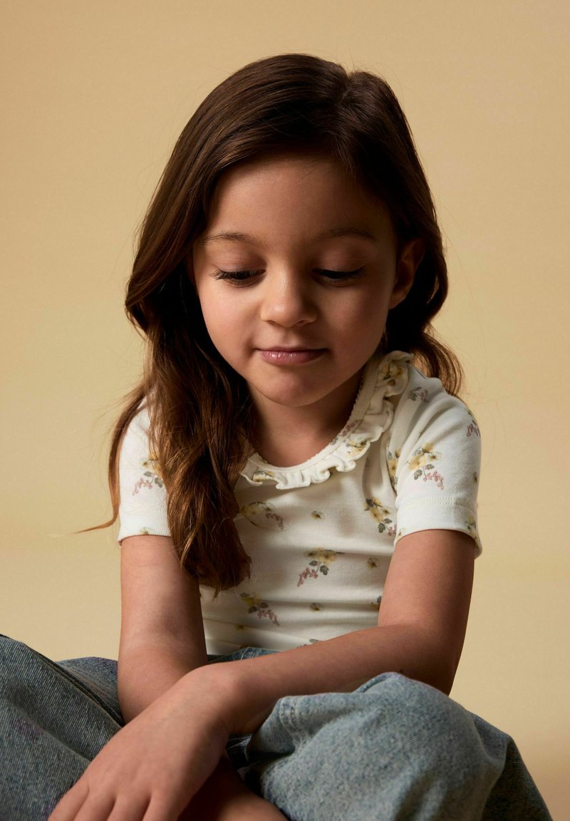 Νεαρό κορίτσι με μακριά καστανά μαλλιά, φοράει λευκό φλοράλ τοπ με βολάν και κοντά μανίκια και μπλε τζιν, καθισμένη σε μπεζ φόντο.