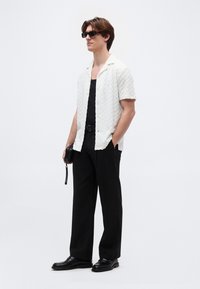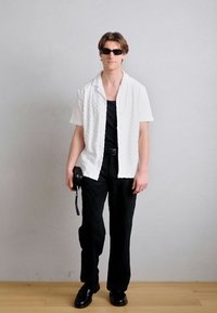 Νέος άνδρας που φοράει μαύρα γυαλιά ηλίου, λευκό υφασμάτινο κοντομάνικο πουκάμισο με κουμπιά, μαύρο φανελάκι και μαύρο παντελόνι με λεπτές ρίγες, με τα χέρια στις τσέπες.