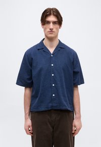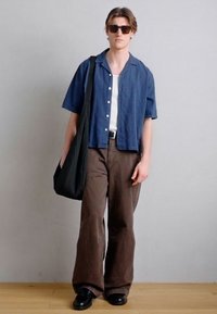 Νεαρός άνδρας που φοράει σκοτεινά γυαλιά ηλίου, γαλάζιο πουκάμισο με κοντά μανίκια και κουμπιά, λευκό φανελάκι και καφέ παντελόνι, με φόντο ανοιχτό γκρι.