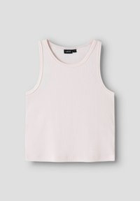 Τρία ριμπ αμάνικα τοπ σε απαλό ροζ, ανοιχτό γκρι και ανοιχτό μπλε, τοποθετημένα επικαλυπτόμενα σε λευκό φόντο.