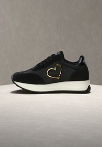 Μαύρο αθλητικό παπούτσι με λευκή σόλα και χρυσή λεπτομέρεια σε σχήμα καρδιάς στο πλάι, μαύρα κορδόνια και λείο υλικό πάνω μέρος.