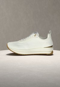 Λευκό πλεκτό αθλητικό παπούτσι με μπεζ σόλα και χρυσή λεπτομέρεια στη φτέρνα, σε πλευρική όψη σε λευκό φόντο.