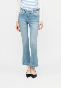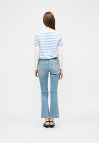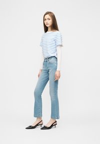 Άτομο που φοράει ανοιχτό μπλε τζιν με φαρδιά πόδια, ριγέ μπλε και λευκό πουκάμισο, λευκά μακριά μανίκια και μαύρα μυτερά παπούτσια, στέκεται σε λευκό φόντο.