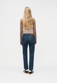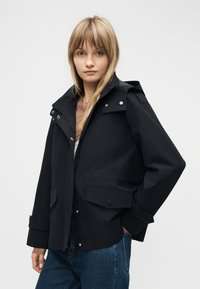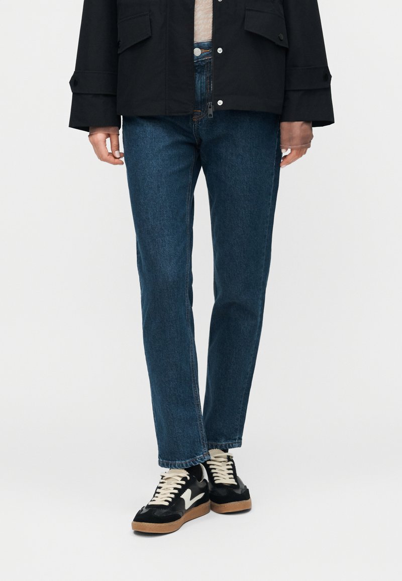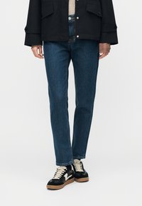 Άτομο που φοράει μπλε τζιν παντελόνι με ίσια γραμμή, μαύρο μπουφάν και μαύρα-άσπρα αθλητικά παπούτσια, στέκεται μπροστά σε απλό φωτεινό φόντο.