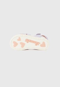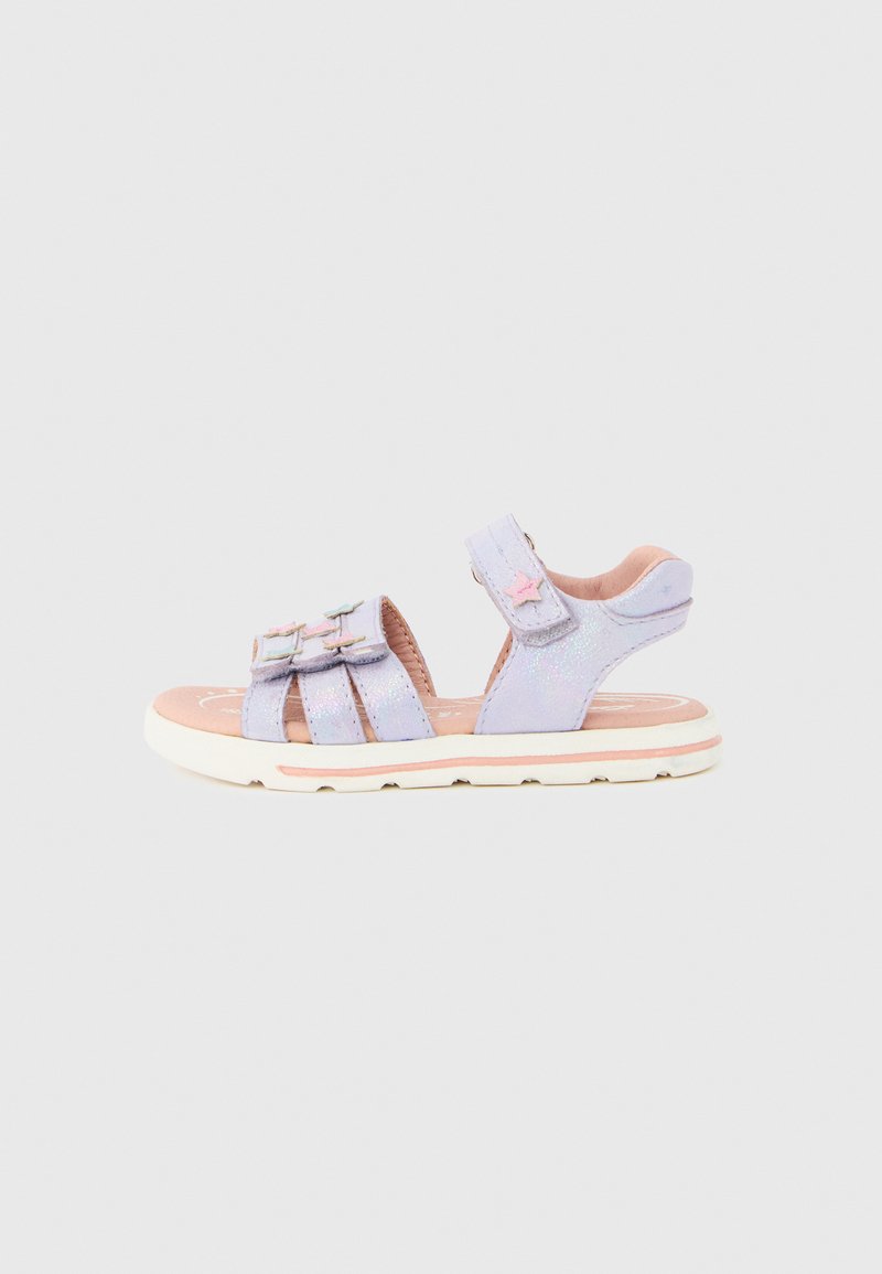 Λιλά σανδάλια με τρεις διακοσμητικές λουρίδες, μαλακό ροζ πάτο και λευκή σόλα με διακριτικές κόκκινες λεπτομέρειες.