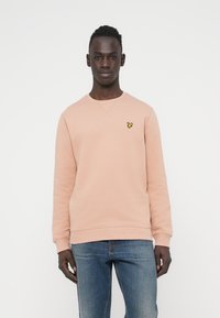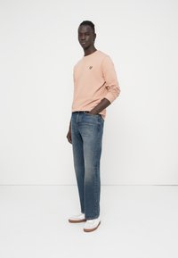 Απαλό ροζ φούτερ από μαλακό ύφασμα, με στρογγυλή λαιμόκοψη και μικρό κεντητό κίτρινο λογότυπο στο στήθος. Συνδυάζεται με μπλε τζιν.